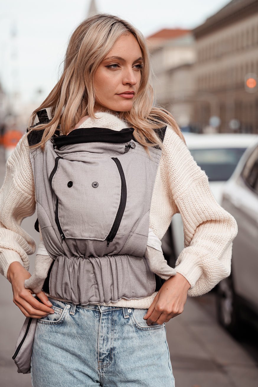 The headrest can be removed by means of a bordered zipper and can be replaced by a more airy headrest. Therefore, two headrests are included in the delivery - one made of KOKADI baby sling fabric and one made of polyester mesh. Of course, the KOKADI Flip Performance Air is also growable thanks to the infinitely adjustable bar and thus enables an ergonomically optimal spread-squat-position for your child when carrying. The woven cross twill baby sling made of 100% organic cotton supports your baby safely and reliably. Our classic \"Just Stone\" design is popular with mums and dads alike. The light weight of 170 g/m² is perfect for very small and light babies!