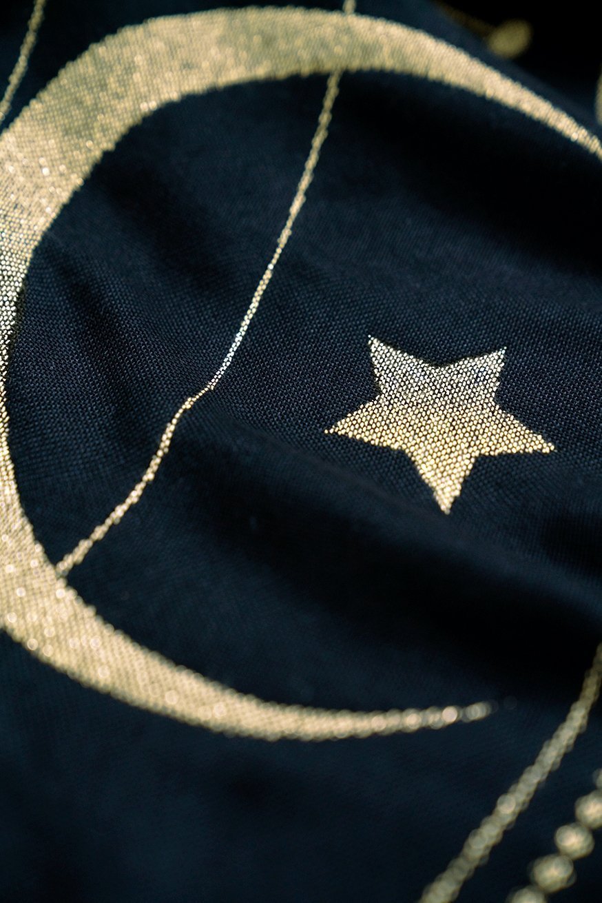 Astrology shows the phases of the moon. The beautiful and magically soft cuddly cloth in noble metal gold is reminiscent of our cosmos and the starry sky. The 2-ply jacquard weave with black and gold threads can be admired from both sides and sparkles with the stars. Due to the cuddly soft blend, it is perfect for cuddling your baby and also for you as a stylish scarf.