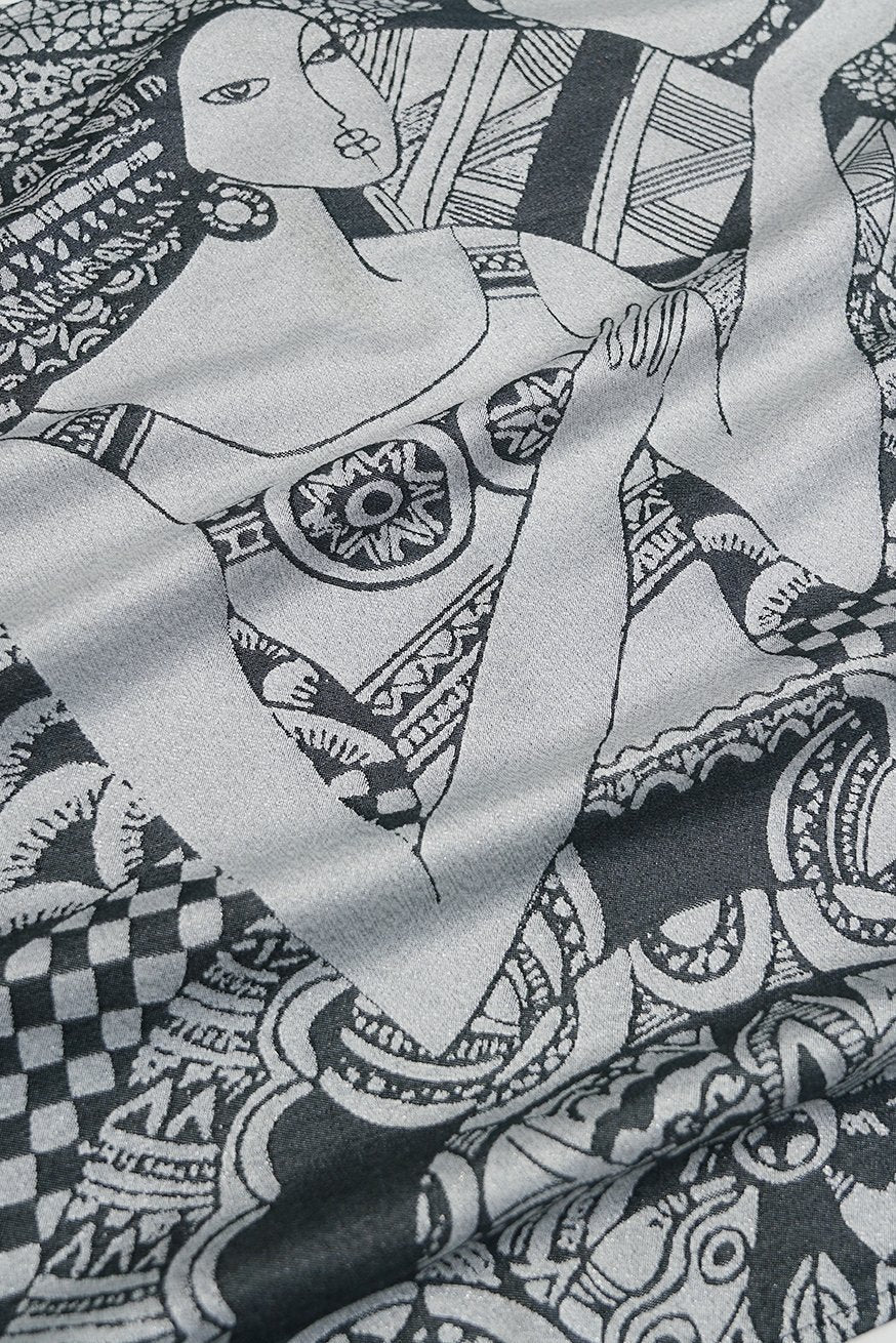Martens Mother is a design with true artistic character. Many different ornaments, light and dark, symbolize the diversity of life. From them a beautiful woman shines powerfully. She stands for the beauty of every human being. Cuddle your baby in this dreamlike, shiny silver RingSling and enjoy the comfort of 49% cuddly viscose (made of bamboo-pulp) and 50% robust organic cotton.