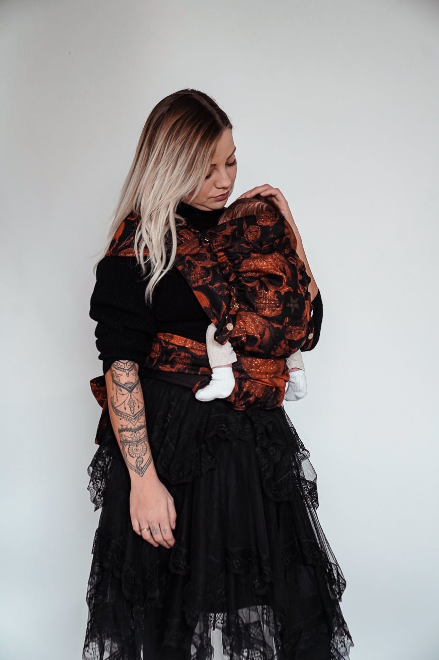 Der KOKADI WrapStar Skulls x Florian ist für Eltern gemacht, die Freiheit lieben – und dennoch Nähe suchen. Tiefschwarze Eleganz trifft auf kupferfarben schimmernde Totenköpfe, die sich wie flüssiges Licht über den Stoff legen. Dieses Design ist kein Accessoire, sondern Ausdruck einer inneren Haltung: stark, eigenständig, unerschrocken und dabei von zeitloser Schönheit.